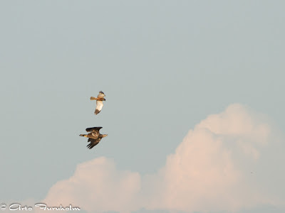 | Haukka häiritsee itseään paljon suurempaa petolintua, joka yrittää väistellä iskuja parhaansa mukaan. |