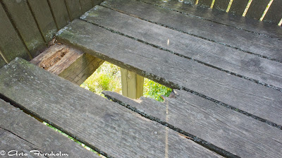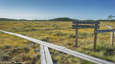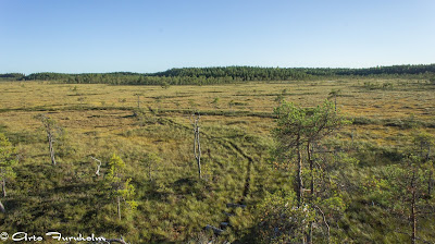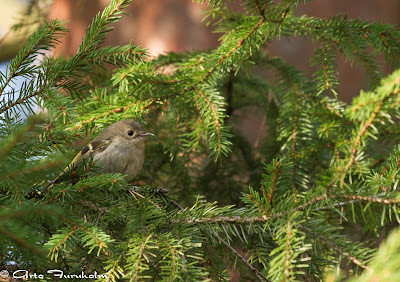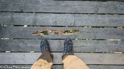 Aivan pitkospuiden loppupäässä oli joukko orneja kaukoputkin ja kiikarein varustettuina selvästi etsien jotakin. He viittilöivät ja huutelivat myös minua kiertämään muuta kautta. Teinkin työtä käskettyä ja menin lopuksi joukon jatkoksi kyselemään mitä olisi tarjolla. Kuuleman mukaan rannassa olisi nähty lyhytvarvaskiurun oleskelevan. Itse olin jo ollut reissussa niin pitkään etten ehtinyt jäämään pidemmäksi aikaa tilannetta seuraamaan. Perheellä oli menoa päivällä, joten reissusta ja sen pituudesta tuli aika paljon sanomista...