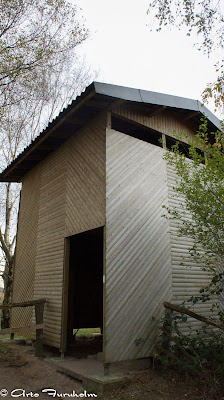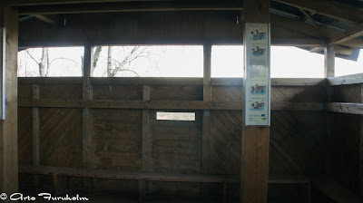 Aikaisemmelta viertailultani muistin, että reitin varrella oli useampia piilokojuja ja saavuinkin seuraavalle hetken kuljettuani. Ilta alkoi hämärtyä, joten kunnon kuvista ei kannattanut enää tällä retkellä haaveilla. Tämä torni oli korkeampi, katettu sivuilta ja sateelta suojasi katto. Tällaisia tarkkailupiiloja soisi näkevänsä myös Suomessa.