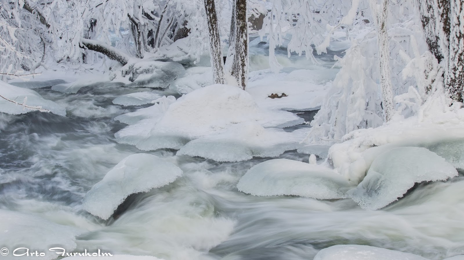 Parhaiten koskikarat löytyivät kuitenkin Myllysillan kupeesta. Valitettavasti itselläni pysähtymispaikka tarjosi ikävän yllätyksen, kun migreeni pukkasi uudelleen päälle. Ei muuta kuin nopeasti uutta lääkettä ottamaan. Kuohuva koski hienossa talvisessa miljöössä tarjosi niin makeita kuvausmahdollisuuksia, että niitä ei voinut missata migreenistä huolimatta. Tallentelin muistikortille myös pätkiä liikkuvaa kuvaa. Lisäksi jalustalla sai otetuksi pitkällä valotusajalla kuvia, joissa veden sai näyttämään samettisen pehmeältä.