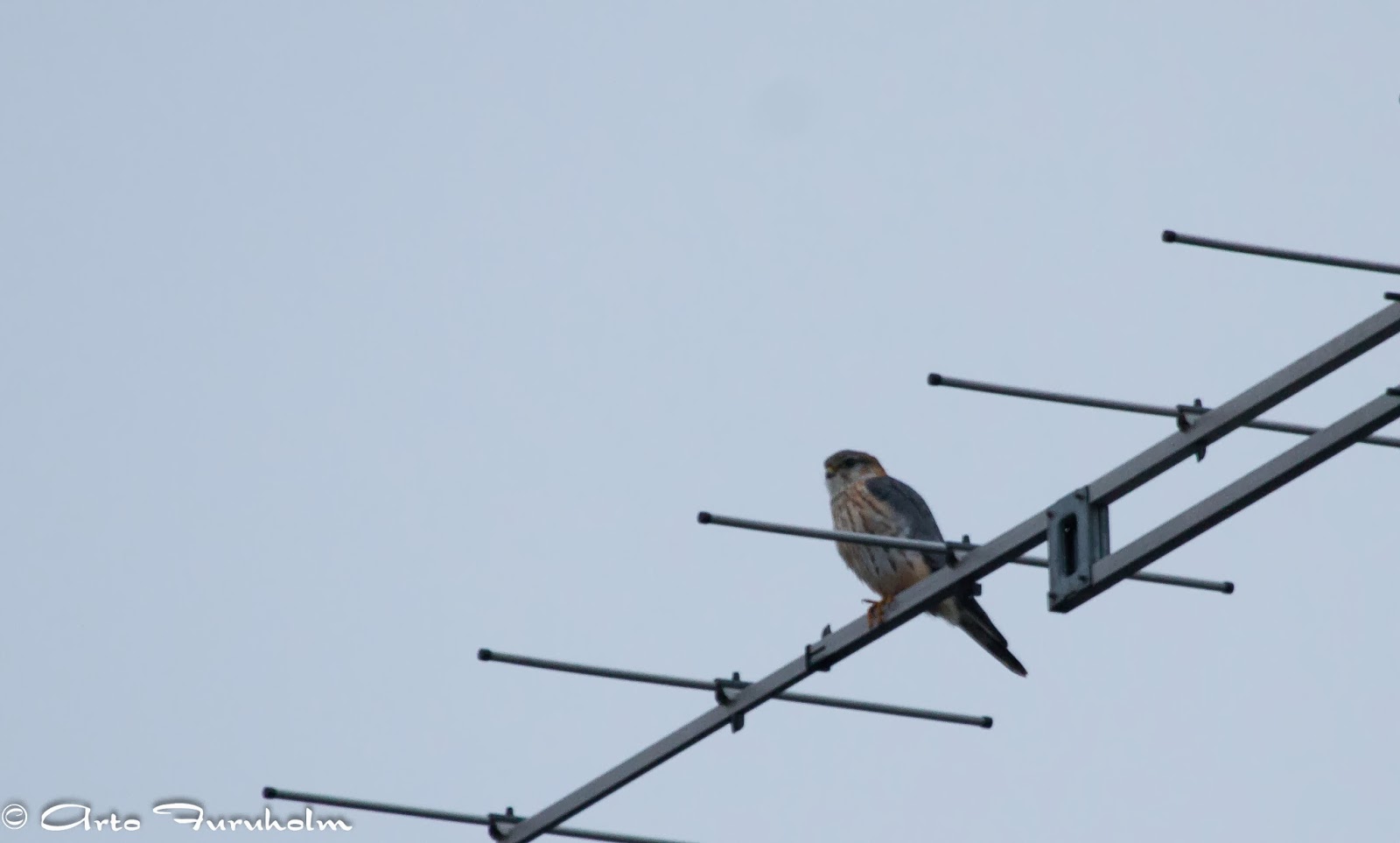 Auringon laskuaika oli noin klo 15.30 aikaan, joten päätin lähteä jo kotimatkalle. Kotimatkalla havahduin entisen UTU-talon pihalta kuuluvaan naputteluääneen. Laskevasta hämärästä piittaamatta ajattelin, että käpytikan nyt ainakin vielä näkee, jos pääsee oikein lähelle ja tosiaan tikkahan siellä naputteli. Parkkipaikalta kuului myös muutaman muun pikkulinnun äänet ja päätin katsoa josko näkisin vielä mitä lintuja parkkipaikan matalissa koristepuissa olisi ja yksittäinen talitiainen siellä oli. Aivan kuin kohtalon ohjaamana näin, että talon antennissa oli jotakin sinne kuulumatonta. Kiikarit silmille ja nopeasti katsottuna lintu siellä oli ja potretti sopi haukan tuntomerkkeihin.