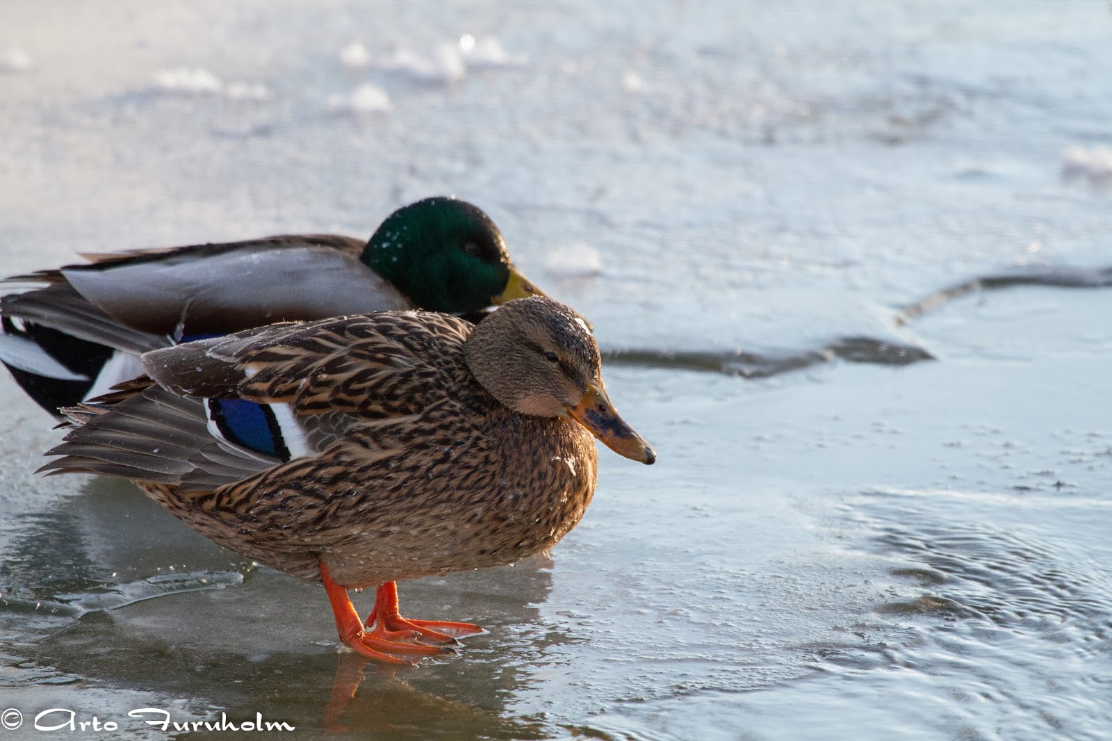 | Sinisorsia kylmissä oloissa joen rannalla |