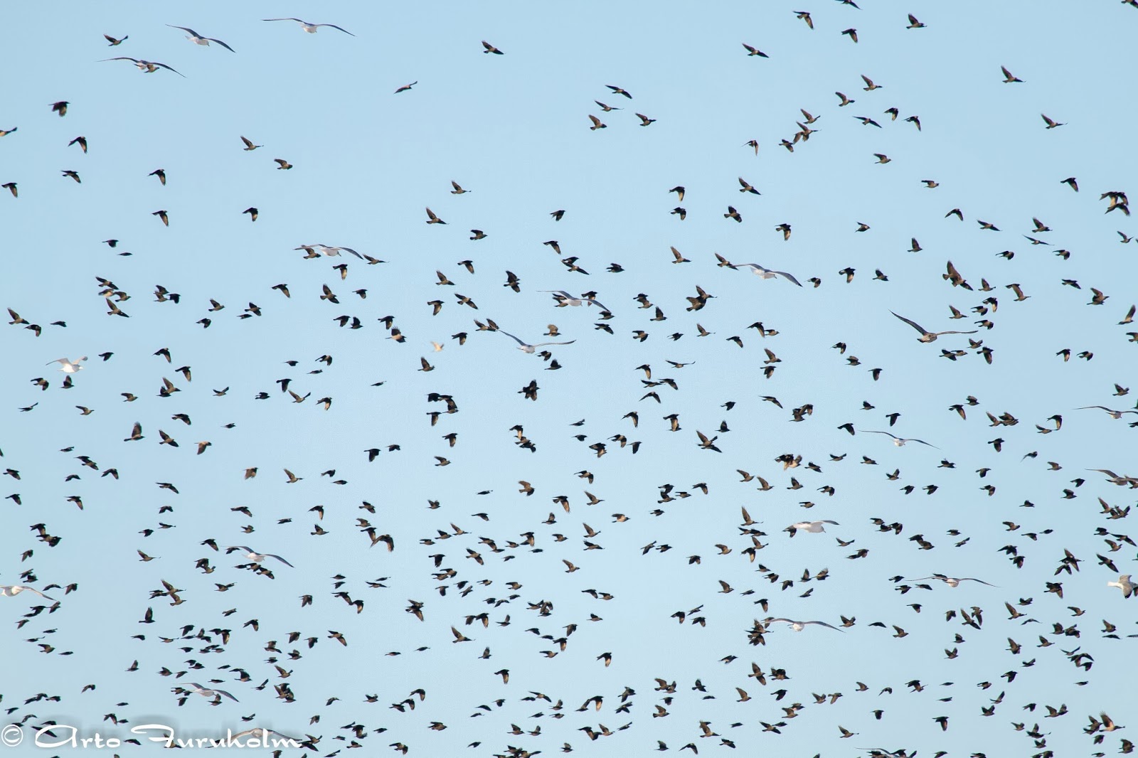 | Naakkoja ja lokkeja valvana metelöivänä parvena kanahaukan hätistelemänä |