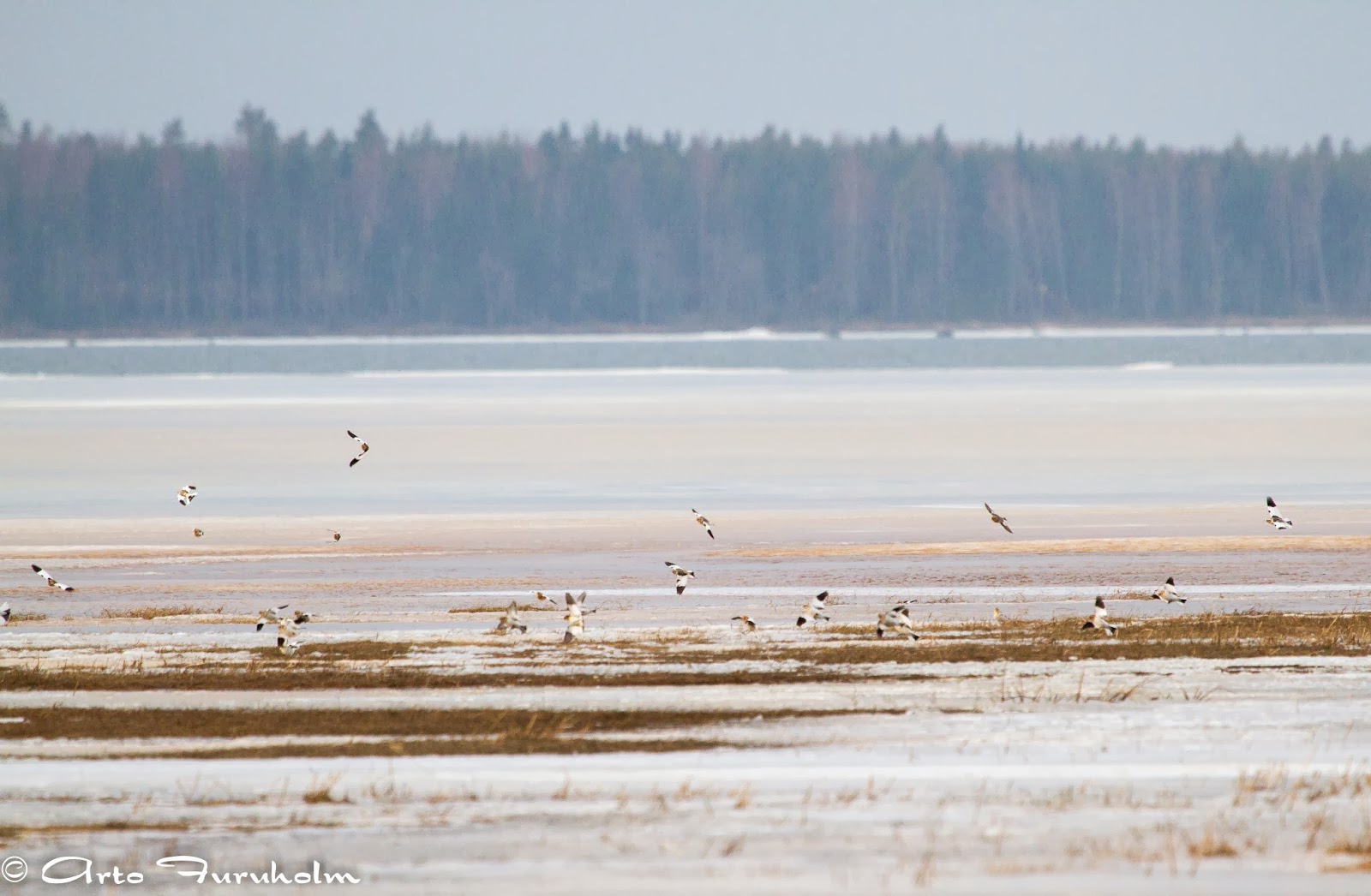 Seuraavana kohteena oli Yyterin lietteet. Avoveden reunalta oli nähtävissä mm. merikotka ja muitakin vesilintuja uiskenteli vedessä, mutta niiden tunnistamista hankaloitti aallokko. Laulujoutsenet oli helposti löydettävissä ja lentoon lähteneet isokoskelot. Myös alueella ollut pulmusparvi oli edelleen paikalla. Viimeksi lietteillä ollessani kuulin vain linnun äänen sen lentäessä lintutornin ylitse. Nyt lintuja oli mukava katsoa läheltä kaukoputken kera.