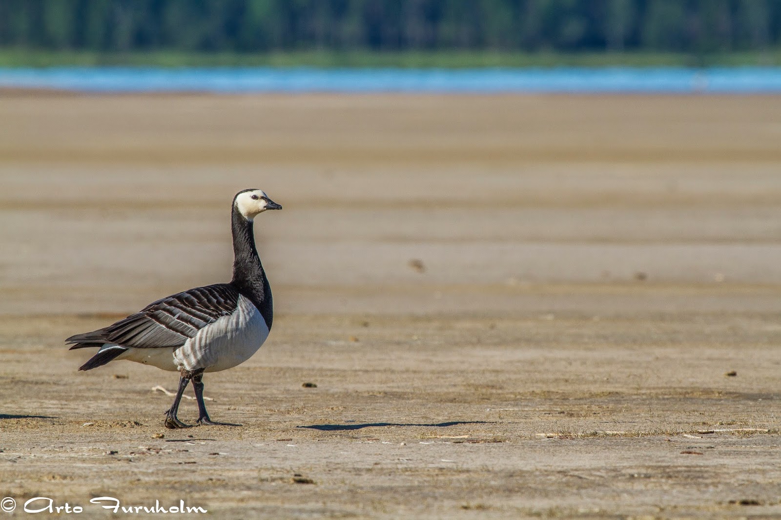 Viimeinen kohde reissulla oli Yyterin lietteet. Aikaisemmista kerroista poiketen päätin kävellä lietteillä sen sijaan, että olisin mennyt uudelle tornille. Jo ensisilmäys lietteille osoitti sen, että lintuja ei juurikaan ollut. Lahdella runsain lintu oli telkkä ja kauempaa lintuja ei voinut tunnistaa lämpöväreilystä johtuen. Laulujoutsen uiskenteli lahdella kahden poikasen seurassa. Valkoposkihanhia oli rannalla kourallinen etsimässä syötävää. Ne päästivät minut sen verran lähelle, että kuvausmahdollisuutta ei voinut jättää käyttämättä.